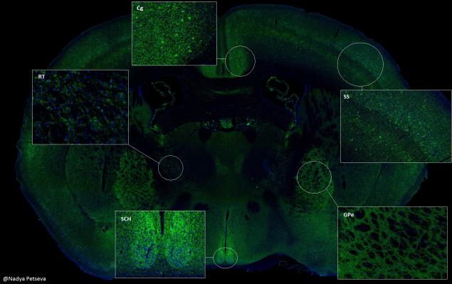 2016-04-26 This week, the Human Protein Atlas is highlighting a new atlas recently released in HPA 14, The Mouse Brain Atlas. This image from The Mouse Brain Atlas was brought to us by Nadya Petseva, a team member on the project. I know what you're thinking, what's a mouse doing in the "human" protein atlas?! Though we typically deal with human cells and tissues in the HPA, it is not currently possible to image full human brain at the cellular level, whereas using a mouse brain we can gain key insights into how proteins in the brain function in situ. This makes mice an attractive "model organism" as their brains actually consist of very similar regions to those found in humans. Using this mouse model gives us a larger overview of the different brain regions where proteins are located and what parts of those cells it is localized to. The protein labeled in Fig 1. is an image of the antibody Glutamate Decarboxylase 1 (GAD1) in mouse brain. GAD1 catalyzes the conversion of glutamic acid to gamma-aminobutyric acid (GABA) which is the major inhibitory neurotransmitter in the central nervous system (Pinal & Tobin 1998). This mechanism is used in nearly all inhibitory synapses (connections) in brains (human and mouse) to regulate the neuronal interactions. Neurons that produce GABA are called "GABAergic". As the major regulator for inhibitory neurotransmission, it is no surprise that GAD1 is key for proper brain function. Among other diseases, GAD1 is believed to play a key role in Parkinson's disease (Zhang, Chammas, & Soghomonian 2015) The inserts in Fig 1 show higher magnification images of GAD1 distribution in 5 brain regions. The somatosensory cortex (SS) is responsible for sense of touch and shows pyramidal neurons in the cortical layers. The cingulate cortex (Cg) is involved in memory and emotions and shows strong immunoreactivity in GABAergic synapses and also interneuron perikarya. The globus pallidus (GPe) and suprachiasmatic nucleus (SCH) which modulate movements and circadian rhythm respectively show immunoreactivity in a dense network of GABAergic axons. Lastly, the thalamic reticular nucleus (RT) regulates thalamocortical communication and shows a moderate labelling of the GABAergic synapses passing through it. More data on GAD1 will be available in the next release of the protein atlas. In the meantime, to get a full appreciation of The Mouse Brain atlas, check out SLC2A1, another member of the membrane protein class highlighted in last week's blog. We would like to again thank Nadya Petseva and all the team members of The Mouse Brain Atlas for their hard work on this exciting project! Devin Sullivan |