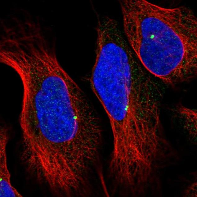 2016-07-08 Let's have a look at another fascinating compartment of the cell, the centrosome! Located in close proximity to the nucleus, the centrosome is so small that it sometimes suffers from being overlooked. However, despite its humble size it is a very important organelle with great impact on cellular function. The centrosome was first described in 1888 and has been a very popular organelle to study among biology researchers ever since (Conduit P.T. 2015). The most well characterized function of the centrosome is to serve as the organizing center for the microtubules that build up the internal architecture of the cell, the so-called cytoskeleton. This function is of extra importance during cell division, where the centrosomes make sure that chromosomes are segregated in the correct manner into daughter cells as discussed in a previous blog. More recent research has expanded our view of the centrosome and today we know that the function of this organelle extends well beyond just serving as the organizing center for the microtubules during cell division. In fact, in some cells the centrosome is not even required for division to occur (Arquint C. et al. 2014). Occupying a volume of just 1-2 µm3, the centrosome is organized into two barrel shaped structures called the centrioles. These centrioles are further organized into a nine-fold sub-structure that is symmetrically ordered to maintain both the stability and functional activity of the centrosome. It is not only the proteins residing in the dense area of the centrioles that are important for the functions of this organelle however, surrounding the centrioles is a matrix referred to as the pericentriolar material (PCM) that contains hundreds of proteins that are associated to the centrosomal machinery and also take part in its molecular activities. While some of these will appear very close to the centrosome, others may be slightly more spread referred to as the microtubule organizing center (MTOC). In the confocal images one can commonly see the two centrioles resolved as two small and distinct dots that overlap well with the center of the microtubules shown in red in our images. In Figure 1, the gene called McKusick-Kaufman syndrome (MKKS) is stained in U-2 OS cells, a human osteosarcoma cell line of epithelial morphology. The antibody stains centrosomes in all cell types tested in the subcellular atlas and the localization of MKKS around the two centrioles is visible in every single cell. As the name suggests, disruption of this protein leads to McKusick-Kaufman syndrome, a disease that manifests with impaired development, especially of hands and feet, as well as heart and genital defects. MKKS is a centrosome shuttling protein that localizes to a tube-like structure around the centrioles in the PCM and is important for cell division. In normally functioning cells, MKKS shuttles between the centrosome and the cytosol throughout the cell cycle but when mutated it fails to localize to the centrosome, leading to McKusick-Kaufman syndrome (Hirayama S. et al. 2007). Mutations in MKKS have also been linked to causing Bardet-Biedl syndrome, a disorder whos symptoms include obesity, diabetes, retinal and kidney deficiencies (Kim J.K. et al. 2005, Katsanis N. et al. 2000). We would like to thank all the members of the Subcellular Human Protein Atlas who generate these images and especially to Frida Danielsson for contributing this article about the tiny but mighty centrosome! |