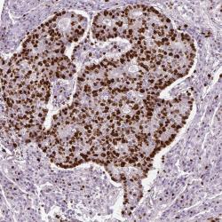 2017-03-03 Today, it is time for the first image of the week from the Cancer Atlas! Lung cancer is one of the deadliest and most common forms of human cancer. Different forms of lung cancer exist and non-small cell lung cancer is the most common form. The cancer image this week is selected from such a lung cancer that has been immunohistochemically stained for the proliferation marker Ki-67 (MKI67). Ki-67 is the most commonly used immunohistochemical marker in rutin cancer diagnostics. The Ki-67 antigen is expressed in all cell nuclei that are active in the cell cycle and thus positive staining in a tumor cell population reflects the level of proliferation in that particular cancer. The image shows part of a lung cancer that grows fast with almost all cancer cells positive for Ki-67. In certain views the cancer appears like invincible creatures, some larger, others smaller, which with brutal frankness and force overgrow and spread throughout our normal organs and body. Explore the Cancer proteome here >> |