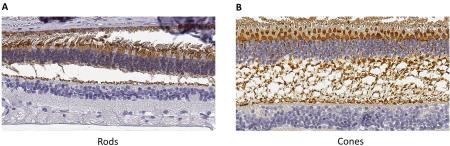 2017-03-24 More than a century ago, Piccolino M. Cajal published his groundbreaking work on the retina. At that time, Cajal was eager to confirm previous observations he had made in other neural tissues, and he considered the retina very suitable to study due to its simple organization and structure. The human retina is a multilayered neural tissue that originates from the developing brain, and populates the innermost layer of the eye, called the inner photosensitive layer. The retina is composed of polarized photosensitive neurons called rods and cones. Rods are extremely light sensitive, and allow us to see in low light conditions, while cones register light at different regions of the visible spectrum, and give us the ability to see colors - red, green and blue. Therefore, seeing color is quite the challenge during the night because rods do not discriminate between wavelength modulations. As light enters the eye through the pupil and gets refracted by the lens, it reaches the neural retina where it is absorbed. The photoreceptor cells transduce the light into electrical nerve signals that are transmitted from the photoreceptors to connecting bipolar neurons, which relay the signal to ganglion cells. The ganglion cell axons are collected to form the optical nerve and the information is sent to the brain. The gene GNGT1 encodes a transducin G-protein that localize to the outer segments of the rods (Figure A) and plays an important role in the cell signaling in the rods. The retinitis pigmentosa 1 protein, encoded by the RP1 gene, is another very important retinal protein found mainly in cone cells (Figure B). The protein is responsible for organizing the photosensitive parts of the cone cells. Mutations in the RP1 gene cause Retinis Pigmentosa, a disorder where the retina degenerates - meaning a continuous destruction of the retinal cells. Formation of pigment clumps at the bottom of the eye is also a common finding and ultimately, overall vision is heavily compromised and affected individuals might lose sight entirely. Besides these two proteins mentioned above, we have listed and analyzed another 41 retinal proteins, and 10 eye proteins, which you can access freely from here.
