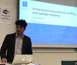 2017-10-09 The last decades of technical development and availability of protein and peptide microarrays have enabled large-scale profiling of antibodies and precise determination of their specificities through epitope mapping. This has enabled characterization of the human immune response and the produced antibodies. Beside exploring the auto-antibody repertoire, this approach also identifies key autoantigens targeted by the antibodies in e.g. neurodegenerative disorders. Arash Zandian defended his PhD-thesis "Array-based autoantibody profiling and epitope mapping" on October 6th where he presented the work he has performed during the last 4 years at SciLifeLab, School of Biotechnology, KTH Royal Institute of Technology. The aim of this thesis was to use affinity proteomics tools to profile antibodies and determine their specificities. For this purpose blood-derived samples were analysed using microarray-based methods. These studies identified potential auto-antigens associated to different neurodegenerative disorders. Here described with articles in the field of narcolepsy (Häggmark-Månberg et al. 2015), multiple sclerosis (Zandian et al. 2017a), psycosis (Zandian et al. 2017b) and malaria (Ch'ng et al. 2017).